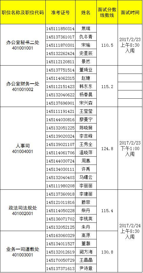 根据国家公务员局2017年考试录用公务员工作的有关规定,现将本局2017年公务员面试有关事项公告如下: 一、参加面试人员名单及面试时间安排