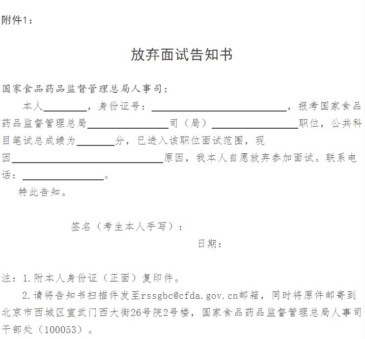 我局2017年度考试录用公务员首批进入面试的人员名单已在国家公务员网站上公布,按照中组部、人力资源社会保障部、国家公务员局2017年度考试录用公务员工作要求,现将有关事项通知如下: 一、面试确认 1.请准备参加面试的考生务必于1月19日前发送电子邮件至rssgbc@cfda.gov.cn确认参加面试。邮件标题统一为“×××确认参加××司局××职位面试”,邮件正文请注明姓名、身份证号、准考证号、公共科目笔试总成绩、通讯地址、联系电话。 2.自愿放弃面试的考生须填写《放弃面试告知书》(见附件1),于1月19日前发送扫描件至rssgbc@cfda.gov.cn,同时将原件(以寄出邮戳为准)邮寄到我局。未按规定时限填写放弃声明且因个人原因放弃面试的,将报国家公务员局记入诚信档案。 二、资格复审材料 请进入面试并拟参加的考生于1月20日前(以寄出邮戳为准)通过邮政特快专递(EMS)将以下材料邮寄到我局(不接待本人或快递公司送达)进行资格复审。 1.考试报名登记表(可在考录专题网站下载),照片需与报考时提供照片一致。准确详细填写个人学习和工作经历,时间必须连续,各阶段学习经历需注明是否为在职学习,取得何种学历和学位,家庭成员(配偶、子女、父母)要填写详细、完整。 2.本人身份证或学生证复印件。 3. 公共科目笔试准考证复印件。 4.本科及以上学历、学位证书复印件。 5.报考职位所要求的基层工作经历有关证明材料。在事业单位、国有企业工作过的考生,需提供单位人事部门出具的基层工作经历证明,并注明起止时间和工作地点;在其它经济组织、社会组织等单位工作过的考生,需提供相应劳动合同或缴纳社保证明的复印件。 6.外语等级证书(成绩单)复印件(限报考科技标准司科技处的考生)。 7.除上述材料外,考生需按照身份类别,同时提供以下材料: (1)社会在职人员需提供所在单位人事部门出具的同意报考证明(见附件2)复印件,证明中需注明考生政治面貌,工作单位详细名称、地址,单位人事部门联系人和联系电话。现工作单位与报名时填写单位不一致的,还需提供离职证明复印件。 (2) 待业人员需提供所在街道或存档人才中心出具的待业证明复印件,需注明考生政治面貌和出具证明单位联系人和联系电话。 (3)留学回国人员需提供我驻外使领馆出具的留学回国证明和教育部留学服务中心认证的国外学历学位认证书复印件。 (4)应届毕业生需提供所在学校加盖公章的报名推荐表(需注明培养方式)复印件。 邮寄地址:北京市西城区宣武门西大街26号院2号楼,国家食品药品监督管理总局人事司干部处,邮编100053。请在信封上注明“2017年公务员面试材料”。 三、注意事项 1.我们将依据考生邮寄的材料进行资格复审。材料不予退还,请做好备份。面试前还将进行现场资格复核,届时请考生携带上述材料原件。 2.考生应对所提供材料的真实性负责。材料不全或主要信息不实,我局将取消其面试资格,并将信息不实等不诚信情况报国务公务员局备案。 3.我局2017年度考试录用公务员面试公告拟于近期在国家公务员局网站上公布,请各位考生密切关注。 联系电话:010-88331569