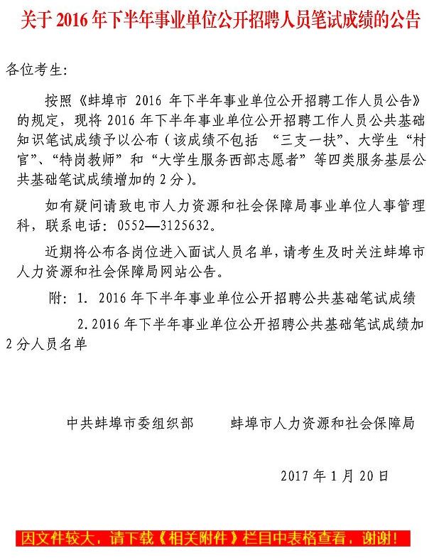 关于2016年下半年事业单位公开招聘人员笔试成绩的公告