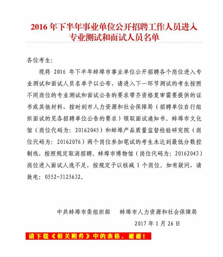2016年下半年事业单位公开招聘工作人员进入专业测试和面试人员名单