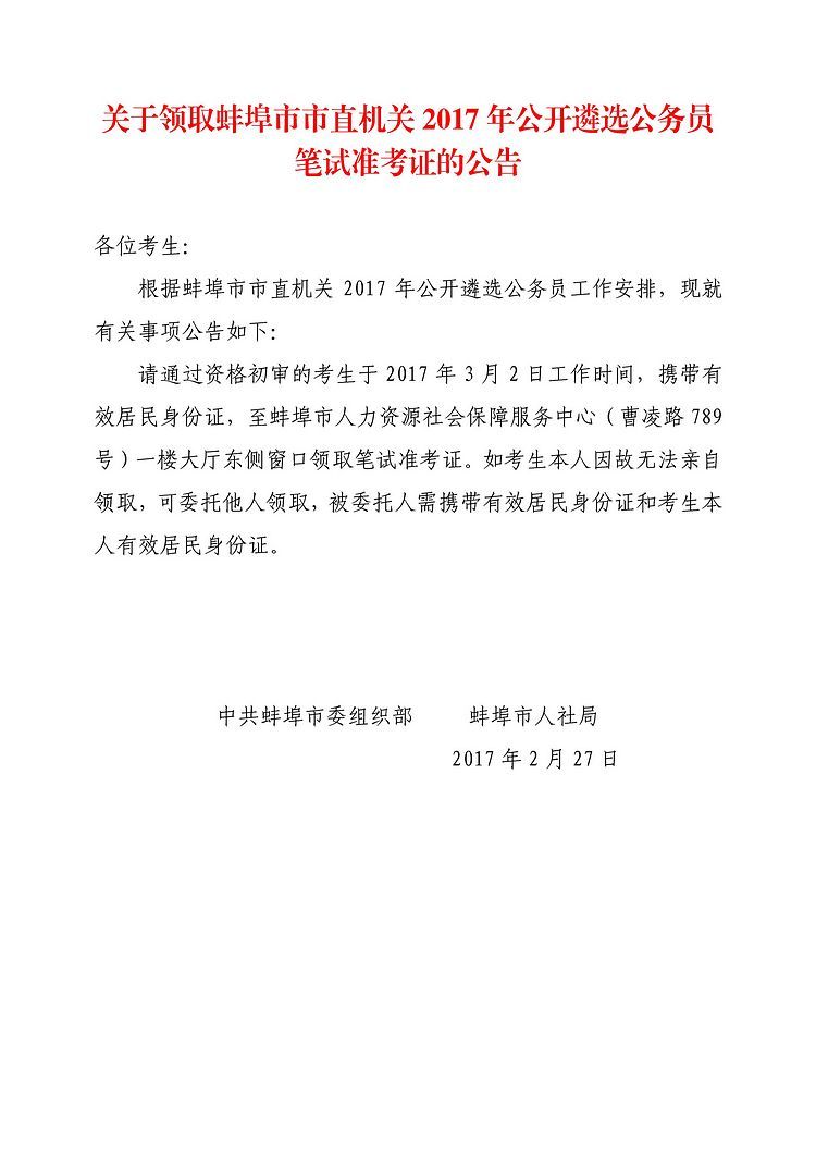 关于领取蚌埠市市直机关2017年公开遴选公务员笔试准考证的公告