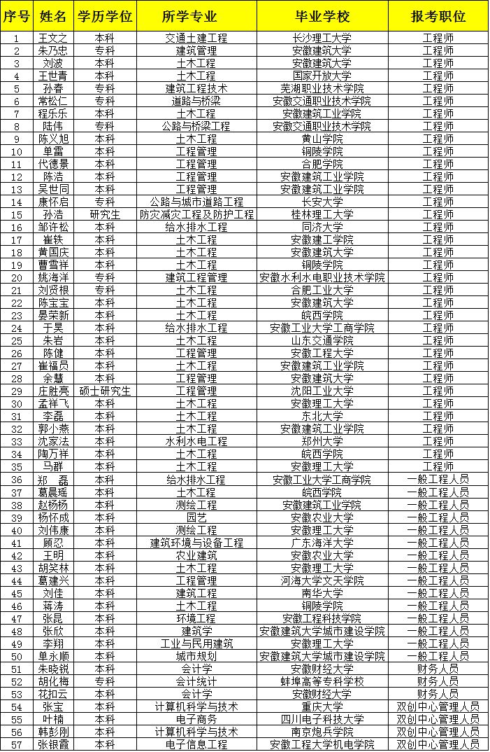 按照《蚌埠禹会建设投资公司招聘公告》招聘条件要求,经初审,以下人员符合招聘条件(名单附后),现将有关现场确认事宜通知如下: 一、现场确认时间及地点 1.时间:2017年3月11日8:30-11:30 2.地点:蚌埠市人力资源大市场2楼202室 二、相关要求 1.考生需携带的材料:身份证、学位证、学历证、一寸彩色照片3张、职称证书、资质证书等证件的原件及复印件。 2.参加资格确认的考生必须本人按指定时间到现场进行资格确认。未在指定时间参加资格确认视为本人自动放弃报考资格。 3.凡有关材料、主要信息不实的,按照相关规定取消该考生报考资格。 三、现场资格确认咨询电话:0552—3857705