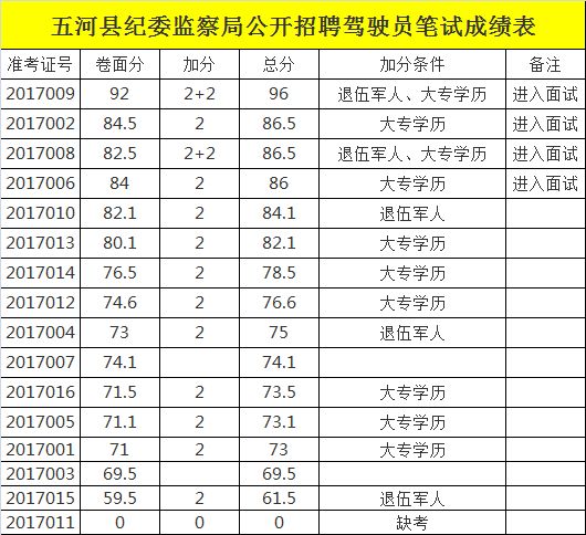 五河县纪委监察局招聘驾驶员笔试成绩公示