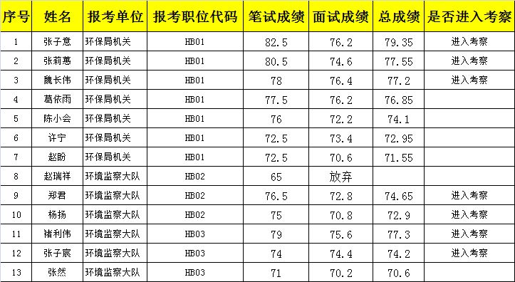 各位考生: 现将环保局2017年公开遴选面试成绩及总成绩进行公示,并根据考试总成绩从高到低的顺序,按照1:1的比例确定进入每个遴选职位的考察人选,具体考察事宜通过电话进行联系。 考生面试成绩及总成绩: