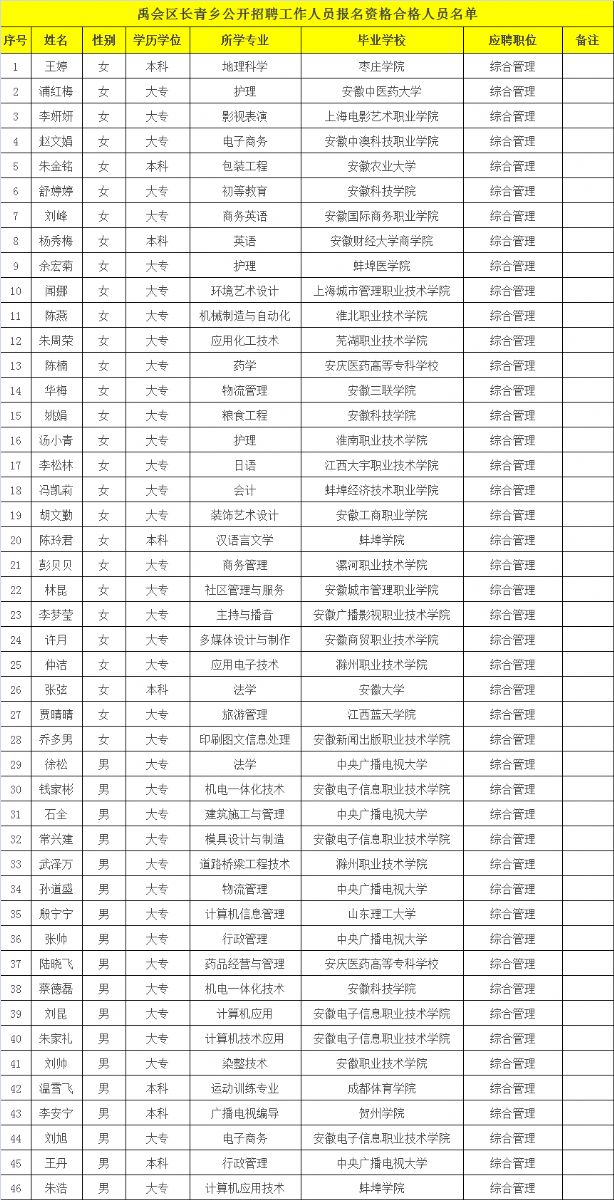 按照《禹会区长青乡政府公开招聘编外聘用制工作人员简章》要求,报名资格审查工作已经结束,合格人员予以公布(名单附后),现将领取笔试准考证相关事项通知如下: 一、领取时间:2017年3月24日(周五)上午:8:30-11:30,下午:2:00-5:00; 领取准考证时请携带本人有效身份证。 二、领取地点:蚌埠市人力资源大市场二楼202室。 三、咨询电话:3857705。