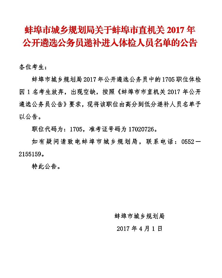 蚌埠市城乡规划局关于蚌埠市直机关2017年公开遴选公务员递补进入体检人员名单的公告