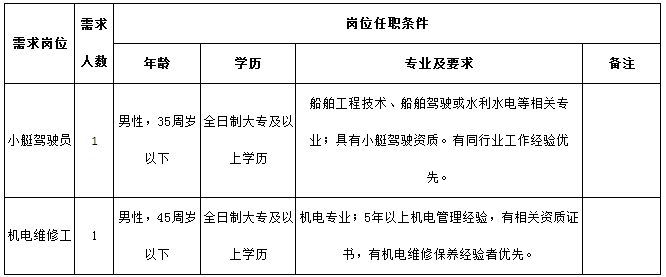 安徽浍河固镇船闸开发有限公司是省属国企安徽省港航建设投资集团有限公司控股子公司,成立于2013年5月,注册资本1亿元,从事船闸运营与管理。现因业工作需要,拟公开招聘工作人员2名(见招聘需求)。 一、招聘流程 报名→资格审查→综合考察→体检→录用 二、招聘需求