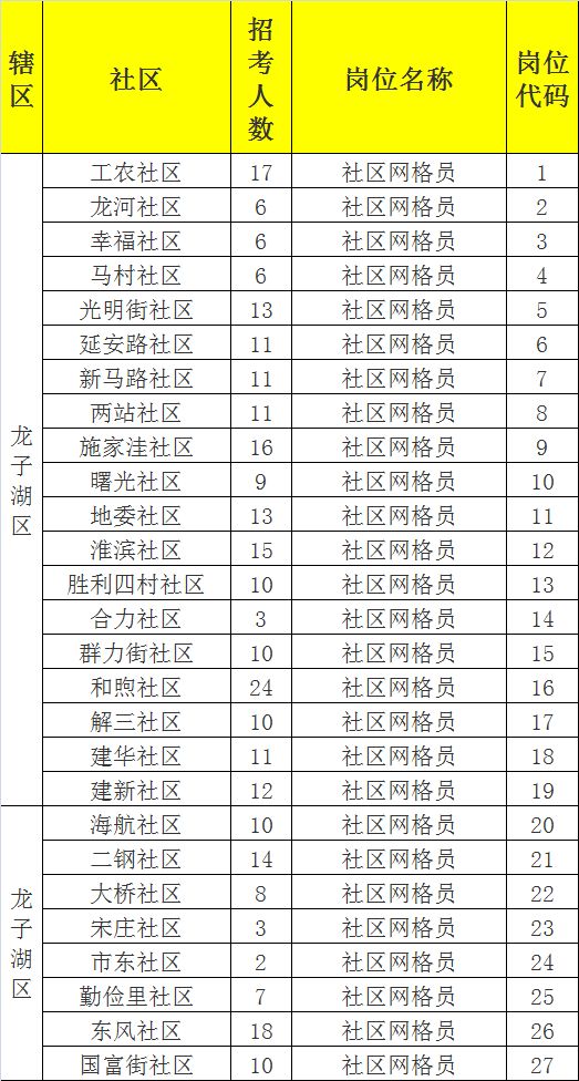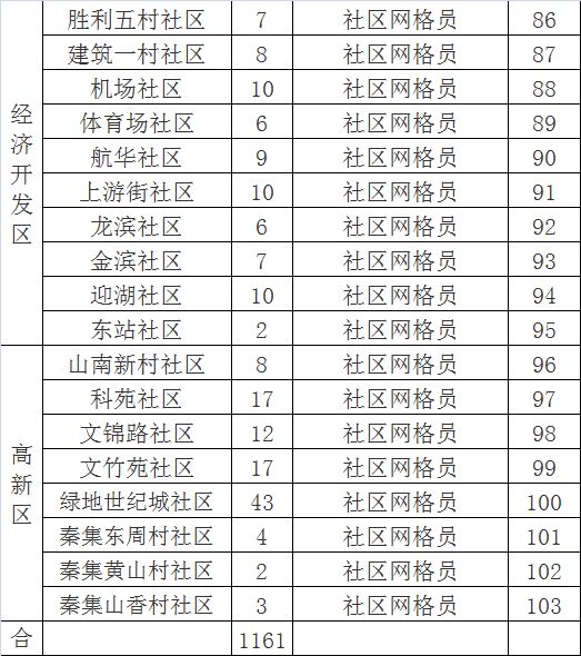 全市共计划招聘城市社区网格员1161名,其中蚌山区185名、禹会区230名、龙子湖区286名、淮上区107名、高新技术开发区106名、经济开发区247名。