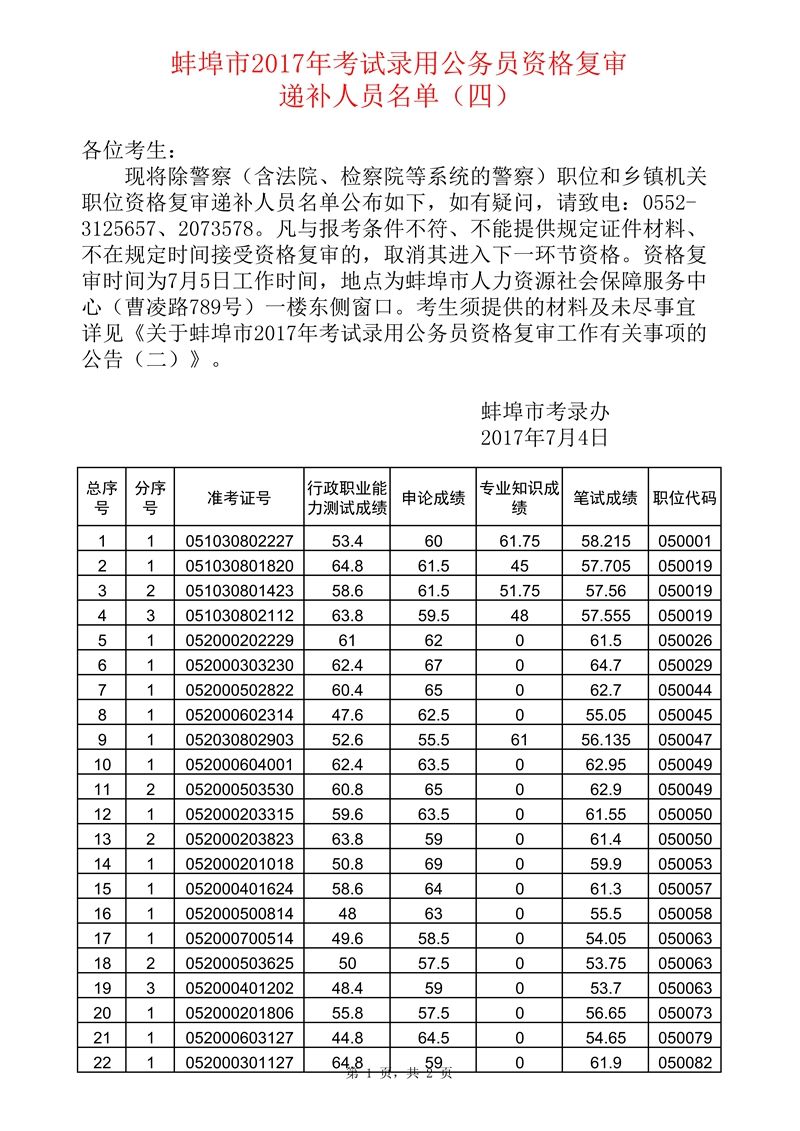 蚌埠市2017年考试录用公务员资格复审递补人员名单(四)